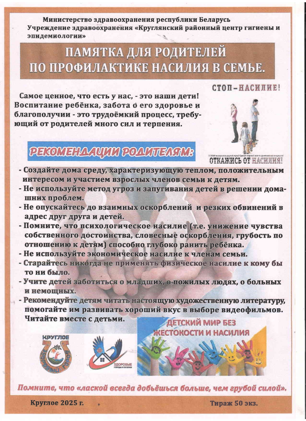 ПамяткиПАМЯТКА ДЛЯ РОДИТЕЛЕЙ ПО ПРОФИЛАКТИКЕ НАСИЛИЯ В СЕМЬЕ cge_1_krug3 недели спустя4 недели спустя00 минуты Навигация по записям Предыдущая: ТАБАКОКУРЕНИЯ НЕТ!Далее: АКТИВНОЕ ДОЛГОЛЕТИЕ